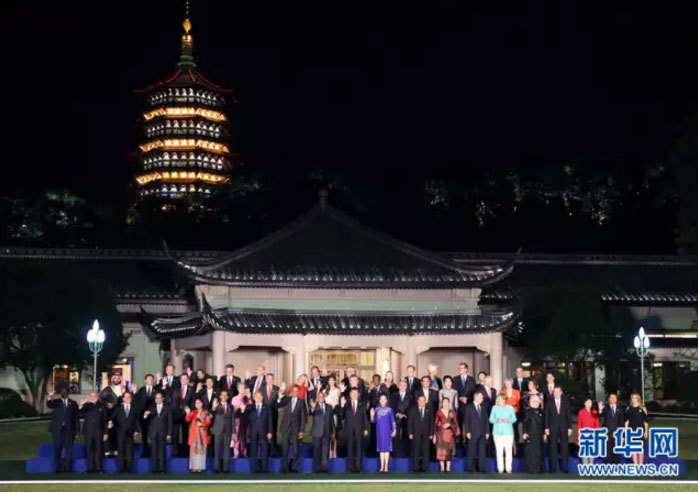 9月4日,国家主席习近平和夫人彭丽媛在杭州西子宾馆举行宴会,欢迎出席二十国集团领导人杭州峰会的外方代表团团长及所有嘉宾。这是习近平和彭丽媛同外方代表团团长及配偶在室外草坪合影留念。新华社记者姚大伟摄